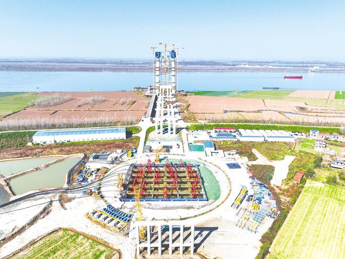 长江汉南大桥南侧锚沉箱就位。 (湖北日报记者黄山供图)