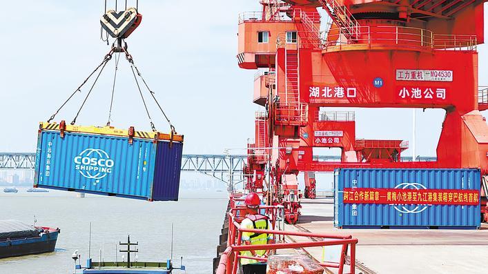 小池港和九江港正在开展集装箱转运合作。 (湖北日报记者蔡江肯 供图)