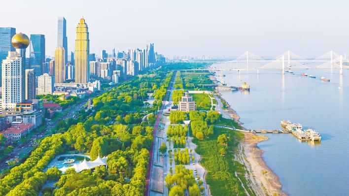 汉口的滨江沙滩郁郁葱葱,风景如画。近年来,武汉以生态为笔,以城市文化为墨,在两江四岸的画卷上描绘出一幅人与自然和谐共处的崭新美丽画卷,打造了160里世界级长江生态廊道。